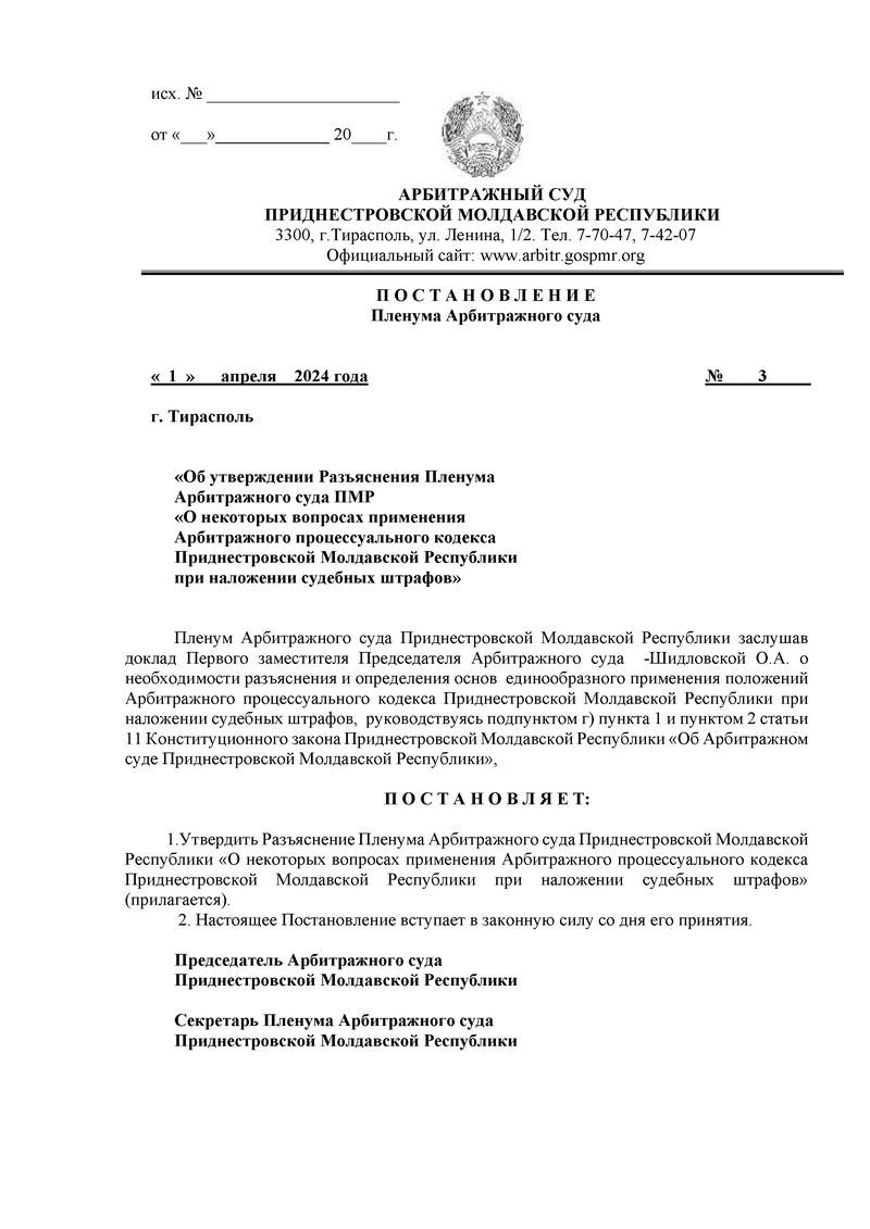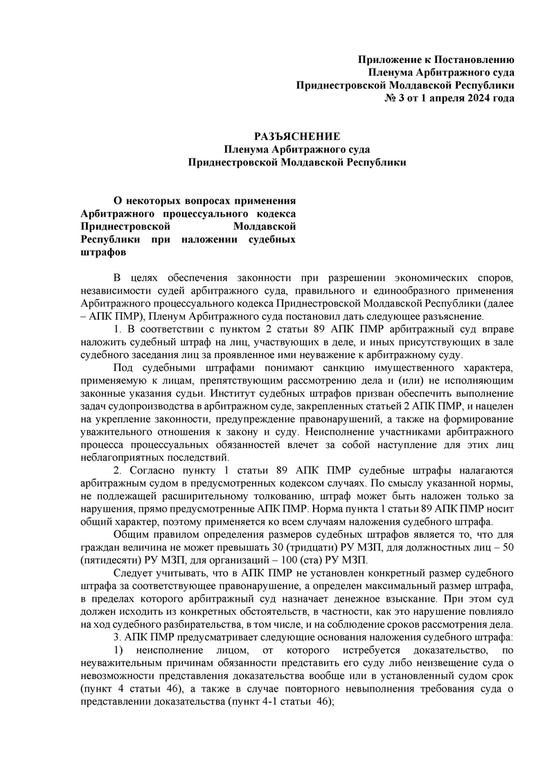 Постановление Пленума от 1 апреля 2024 года "Об утверждении Разъяснения Пленума Арбитражного суда ПМР «О некоторых вопросах применения Арбитражного процессуального кодекса ПМР при наложении судебных штрафов"